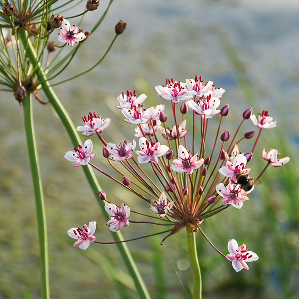 Vivace de lieux humides, ce jonc forme des touffes de longues feuilles étroites et il offre, pendant tout l'été, de magnifiques fleurs en ombelles, blanc rosé et au coeur plus foncé.